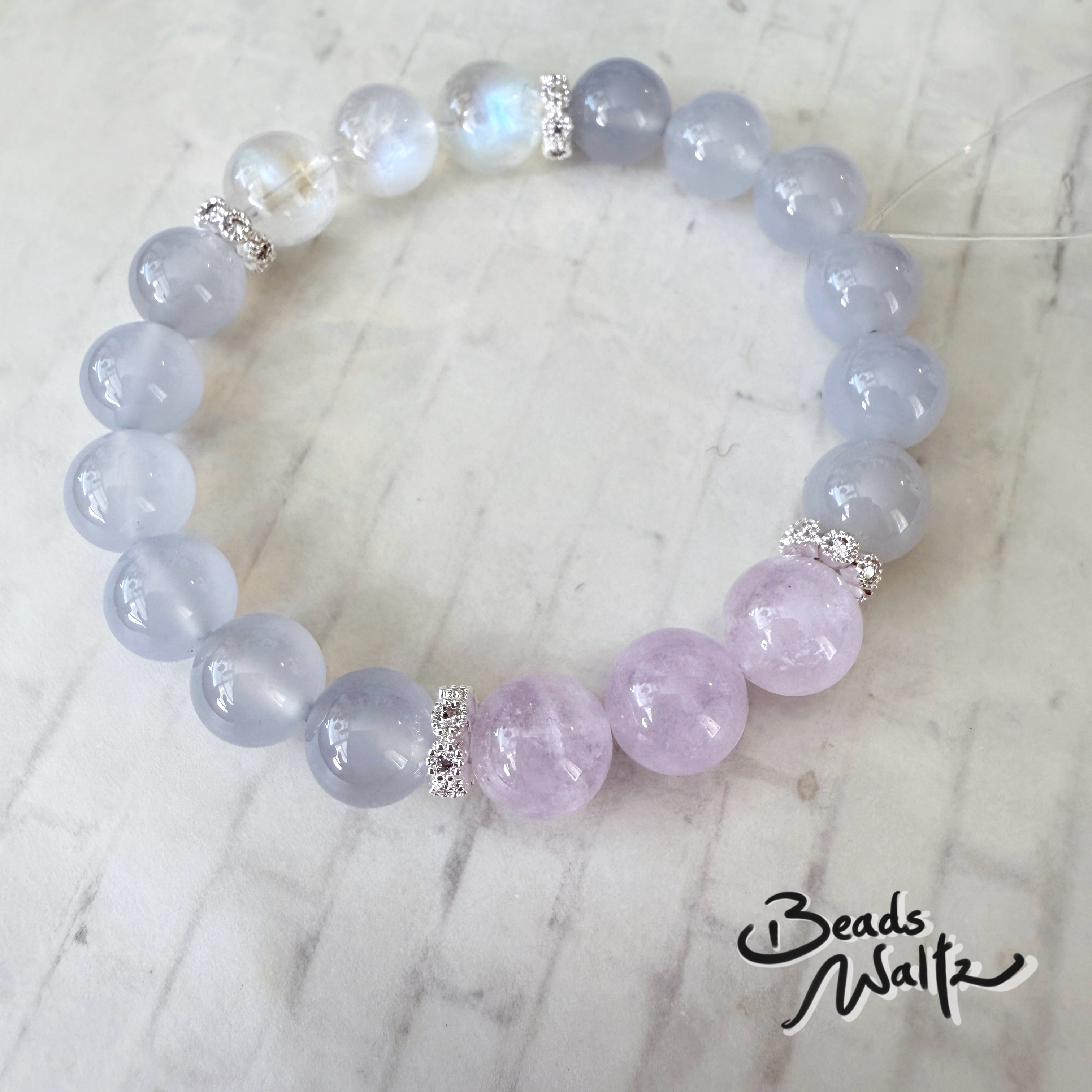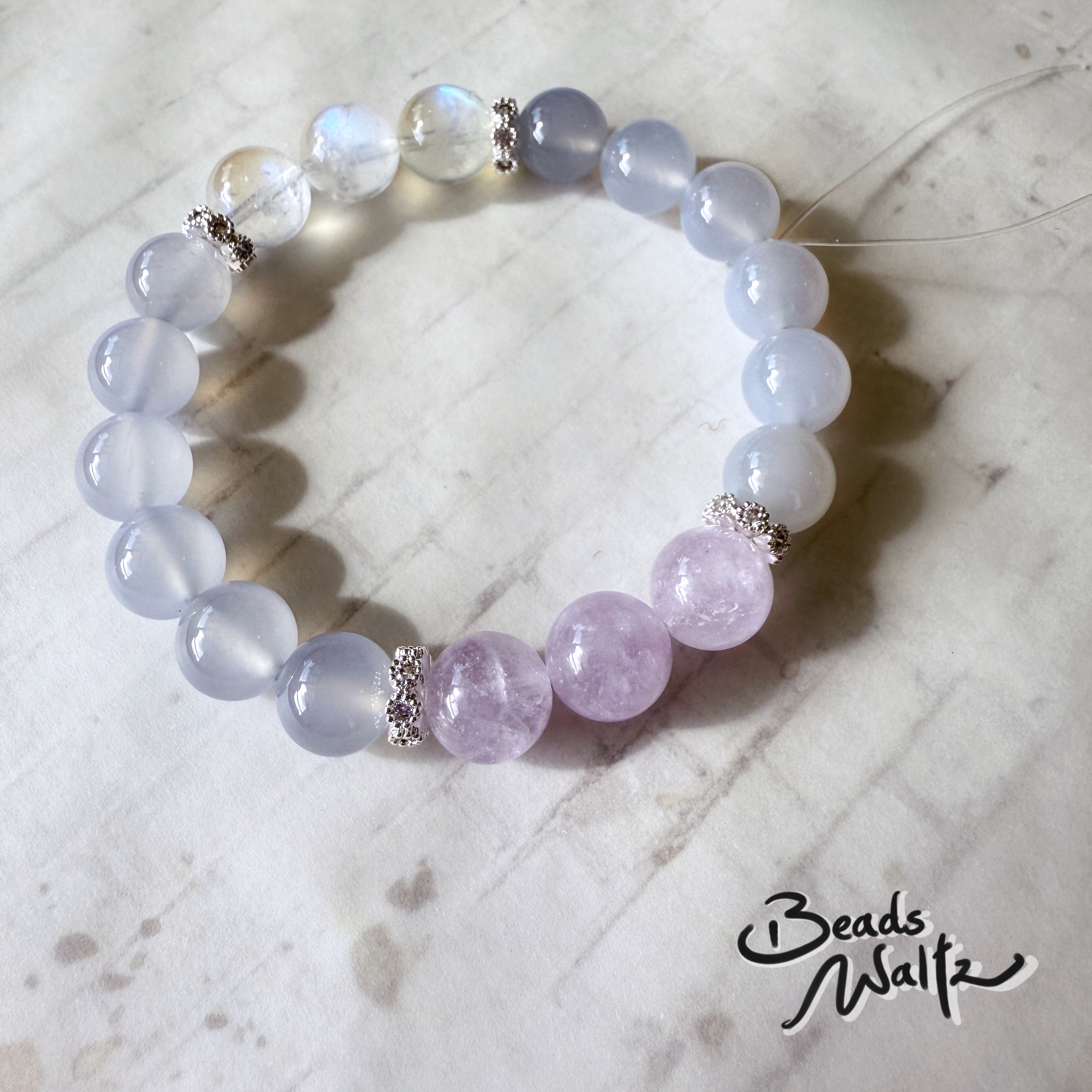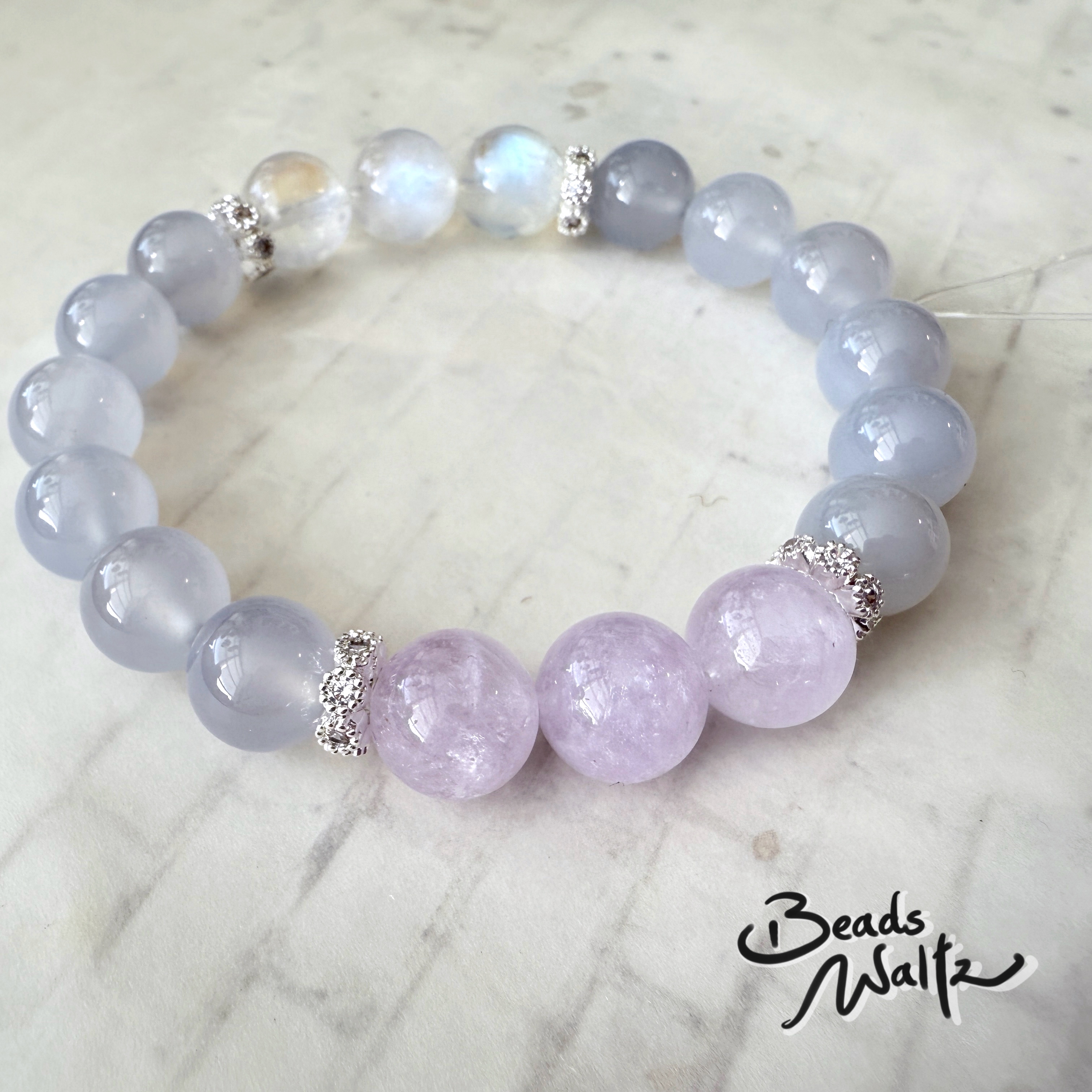 ★ Blue Chalcedony 10mm, Lavender Amethyst 10mm & Moonstone 10.5mm ★ Wrist size: 15.5cm ★ If you need different sizes, please email us: This email address is being protected from spambots. You need JavaScript enabled to view it. 【Blue Chalcedony】 Throat Chakra Enhance expression ability, persuasiveness and speaking skills Able to communicate smoothly and understand others' meanings, improving interpersonal relationships Improve trachea, sore throat, respiratory system and other problems Increase spirituality and intuition Relieve stress, eliminate obsession, confusion and distractions, relieve inner depression, and calm positive soul and emotions Help to break bad habits