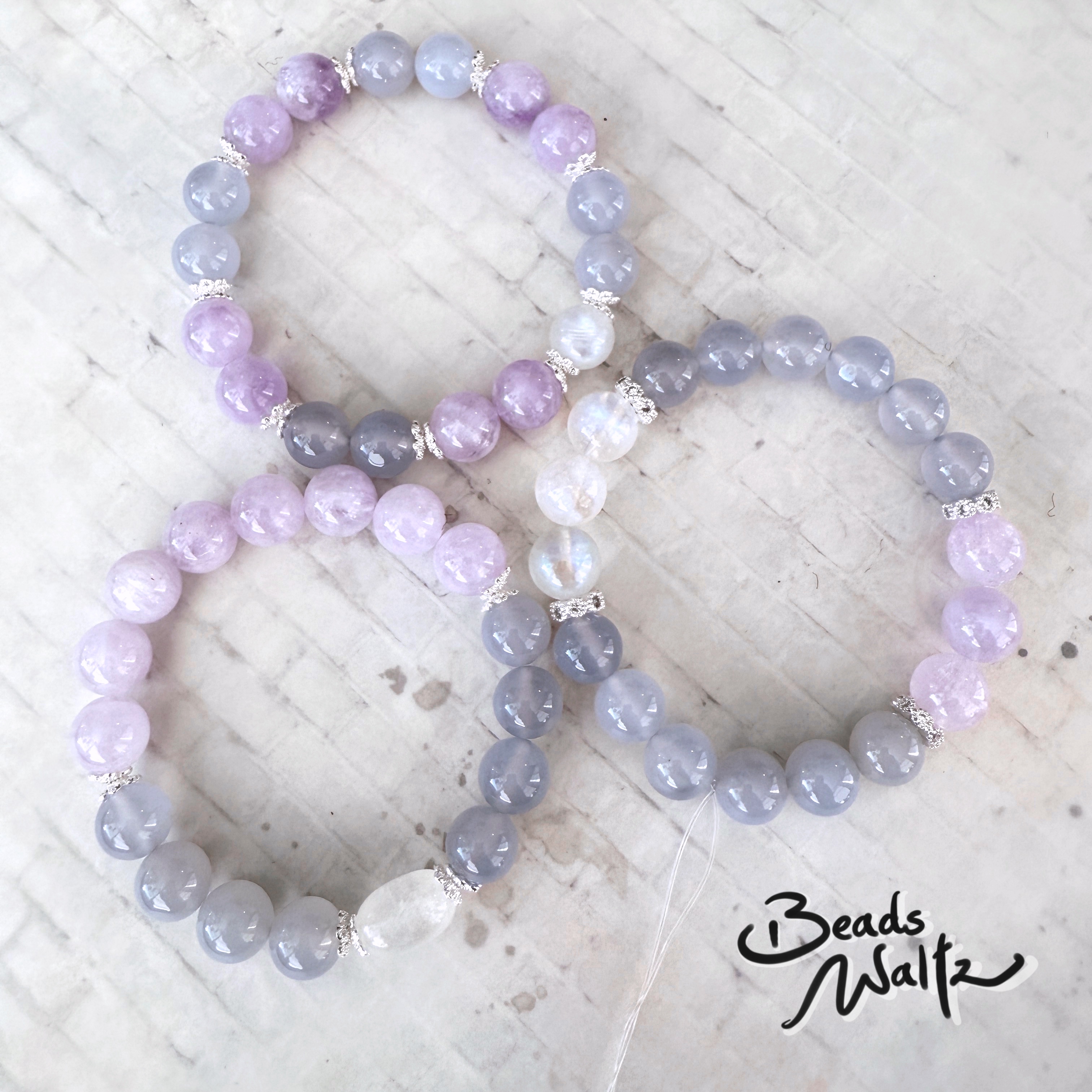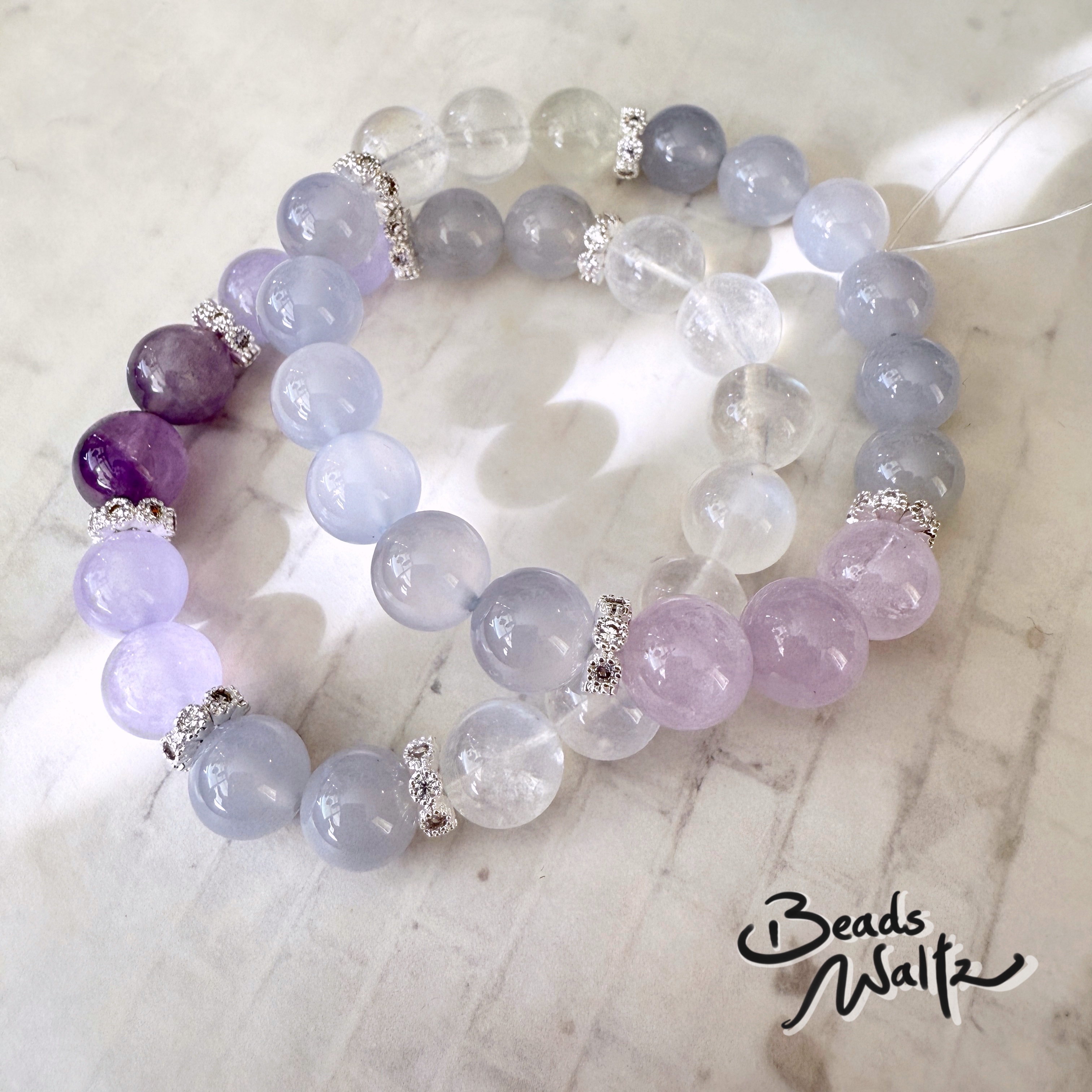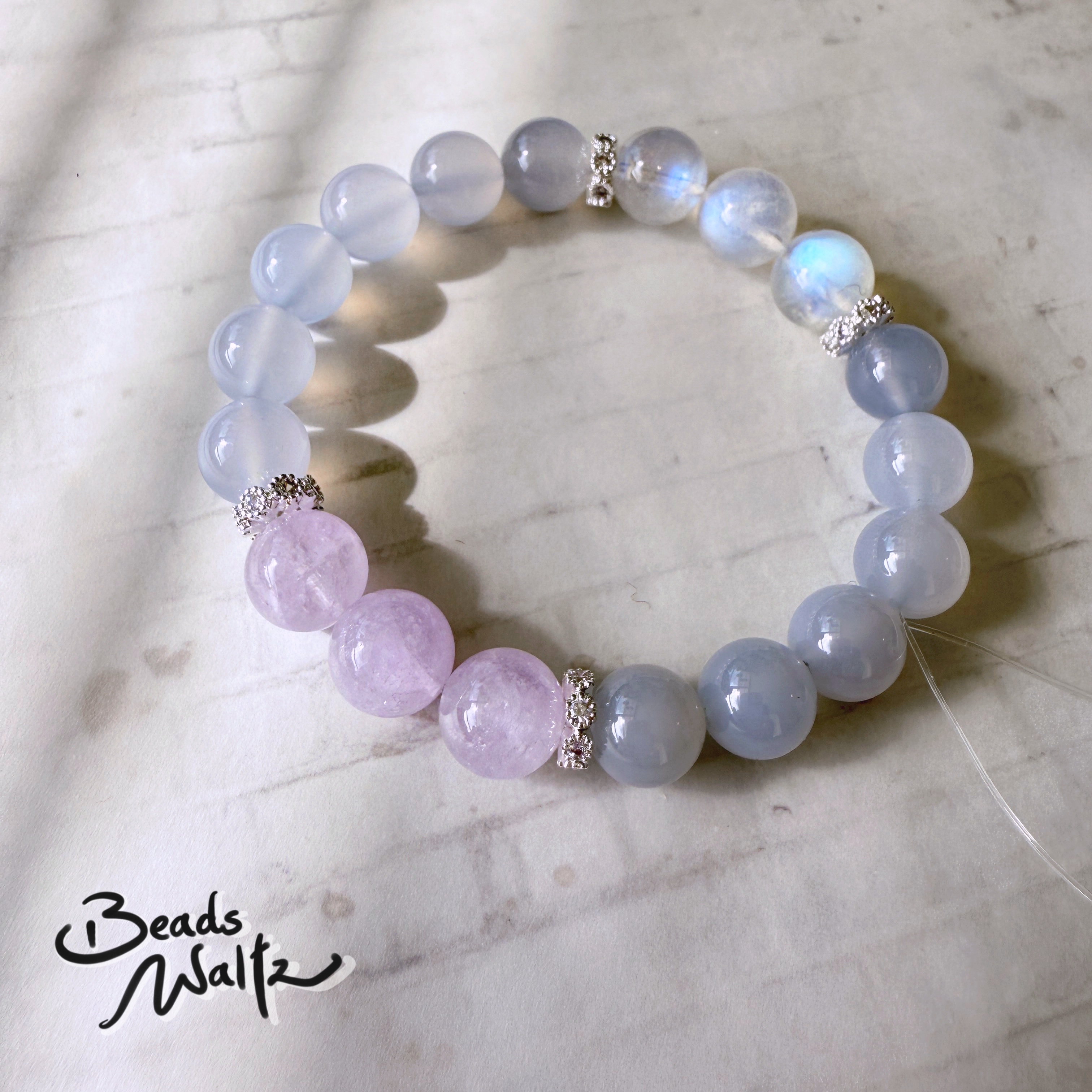 ★ Blue Chalcedony 10mm, Lavender Amethyst 10mm & Moonstone 10.5mm ★ Wrist size: 15.5cm ★ If you need different sizes, please email us: This email address is being protected from spambots. You need JavaScript enabled to view it. 【Blue Chalcedony】 Throat Chakra Enhance expression ability, persuasiveness and speaking skills Able to communicate smoothly and understand others' meanings, improving interpersonal relationships Improve trachea, sore throat, respiratory system and other problems Increase spirituality and intuition Relieve stress, eliminate obsession, confusion and distractions, relieve inner depression, and calm positive soul and emotions Help to break bad habits