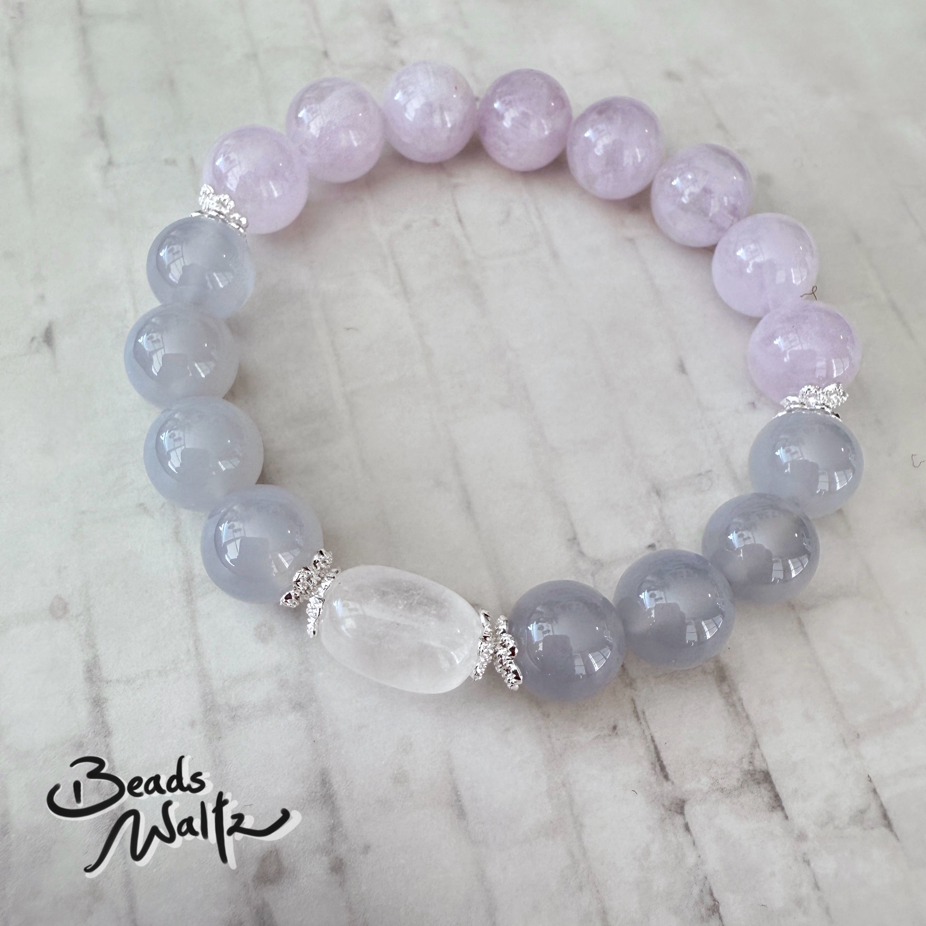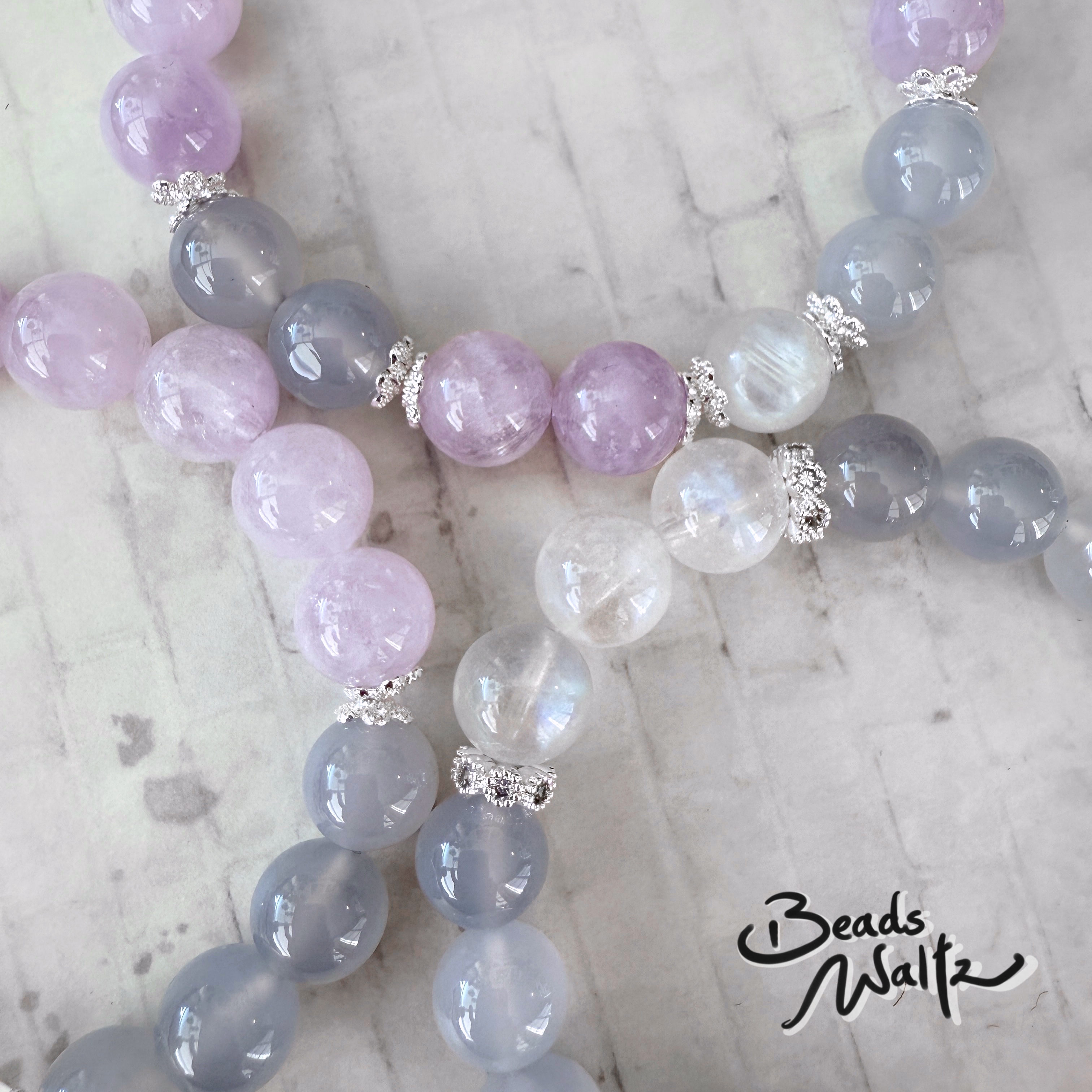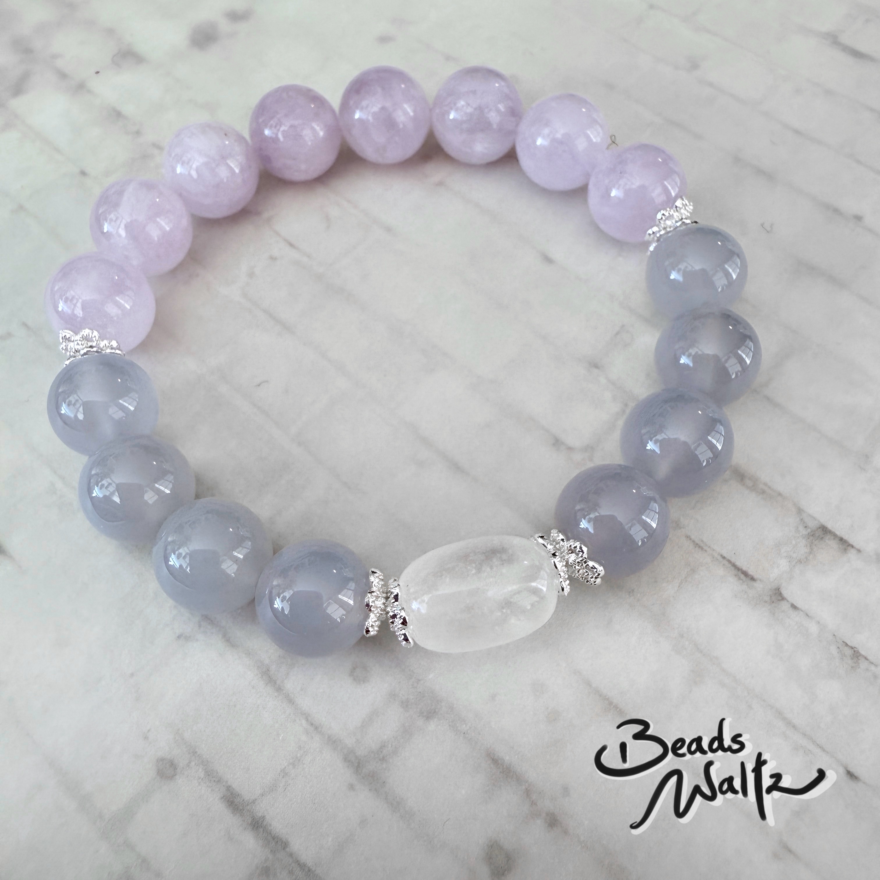 ★ Blue Chalcedony 10mm, Lavender Amethyst 10mm & Moonstone 9-10 x 11-13mm ★ Wrist size: 16.5cm ★ If you need different sizes, please email us: This email address is being protected from spambots. You need JavaScript enabled to view it. 【Blue Chalcedony】 Throat Chakra Enhance expression ability, persuasiveness and speaking skills Able to communicate smoothly and understand others' meanings, improving interpersonal relationships Improve trachea, sore throat, respiratory system and other problems Increase spirituality and intuition Relieve stress, eliminate obsession, confusion and distractions, relieve inner depression, and calm positive soul and emotions Help to break bad habits
