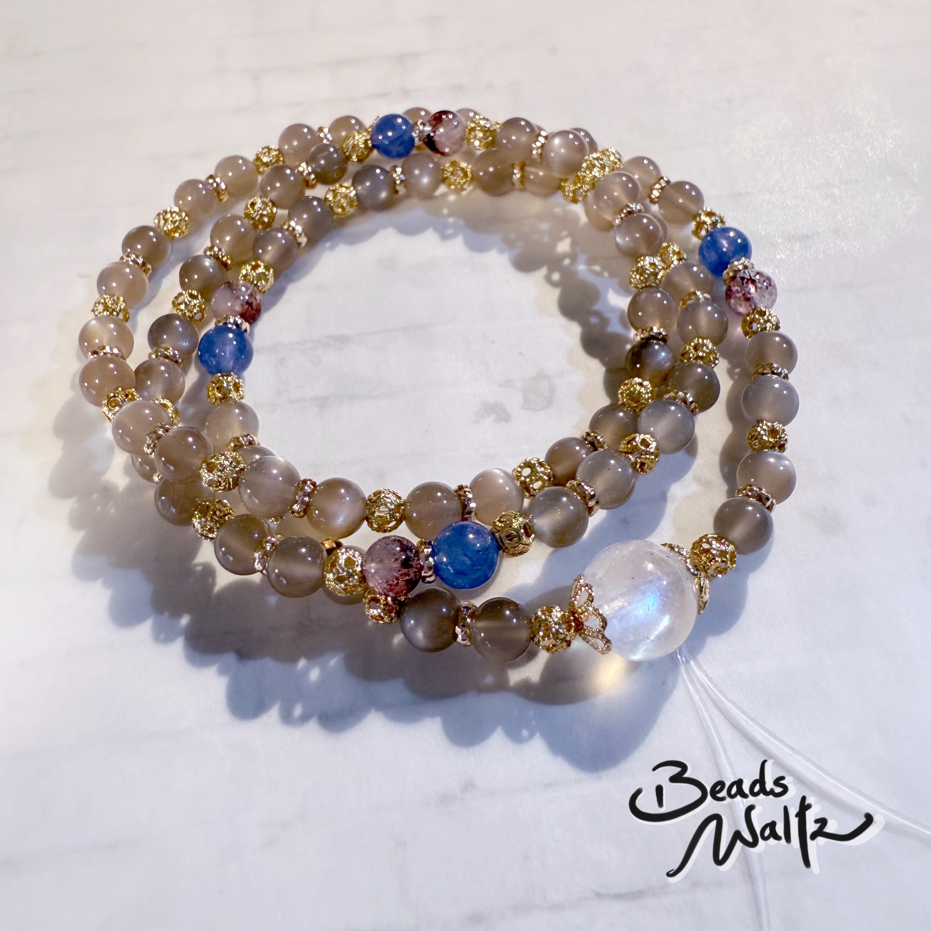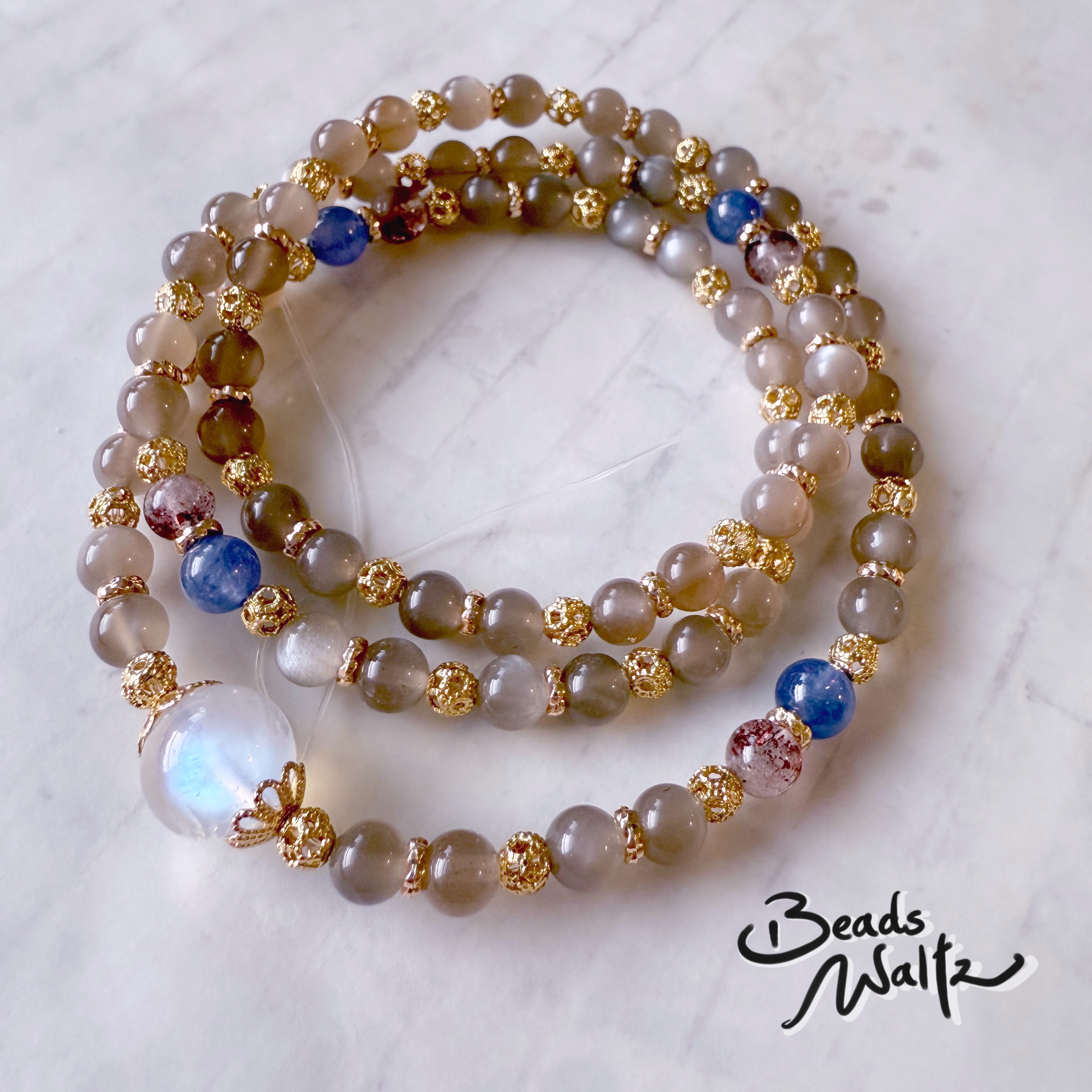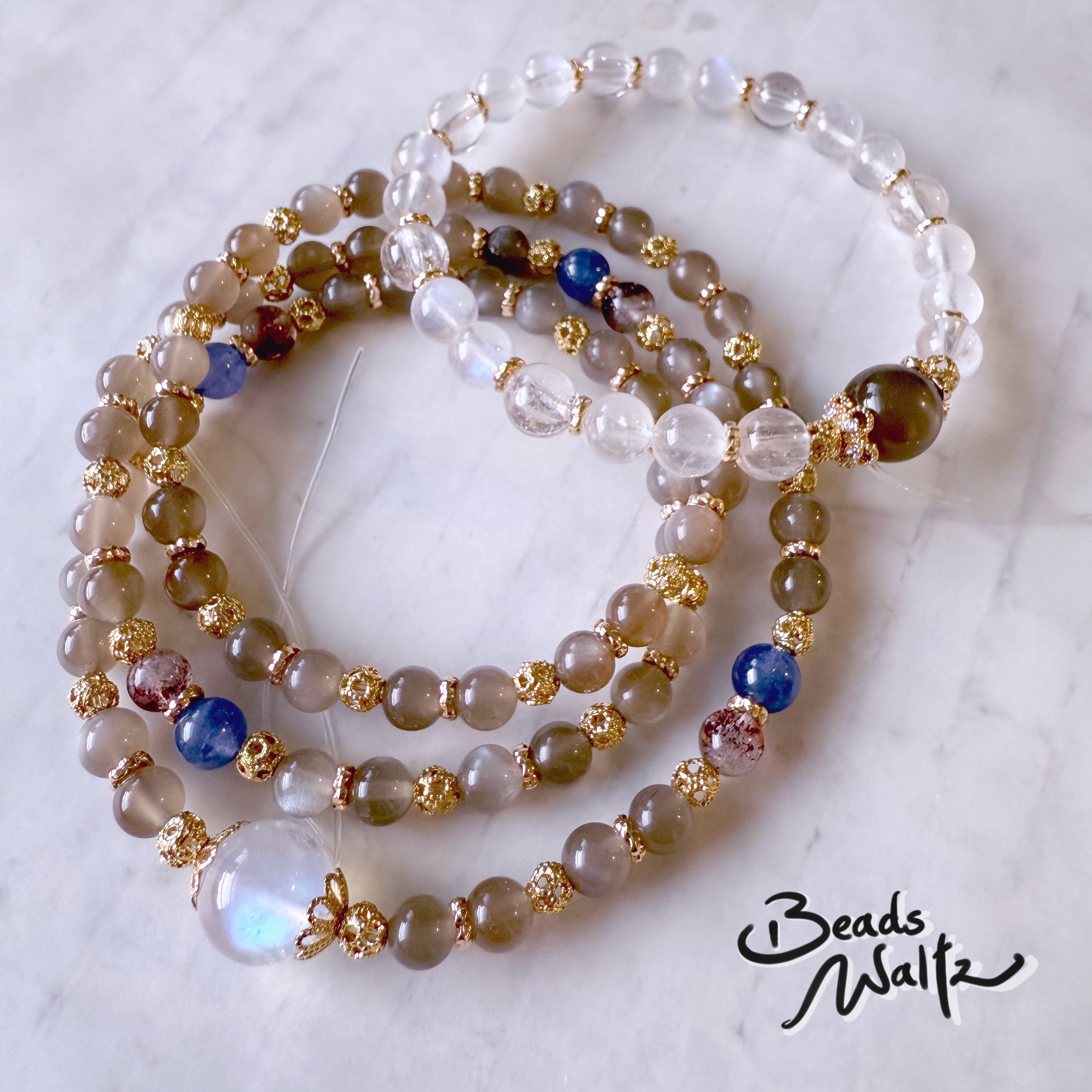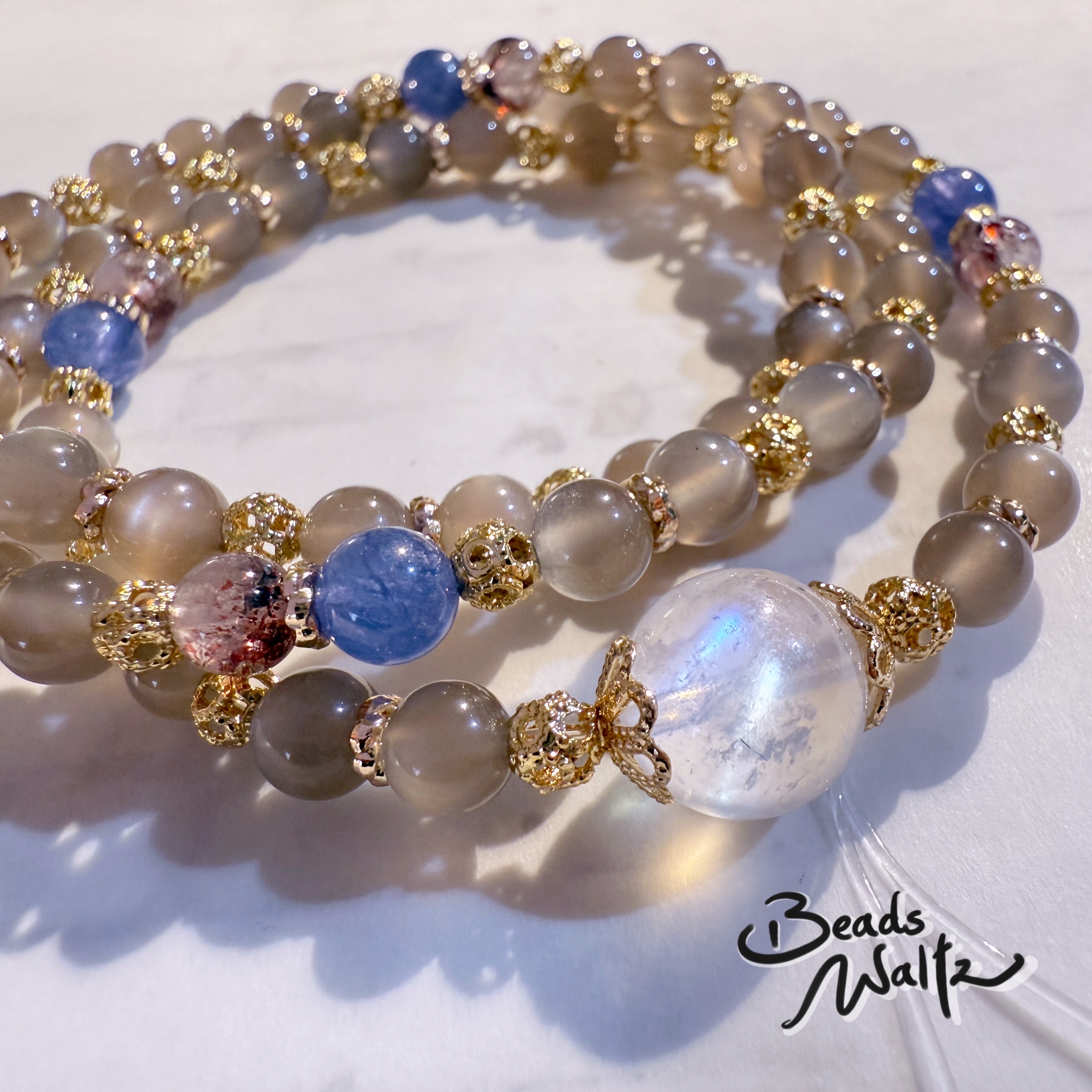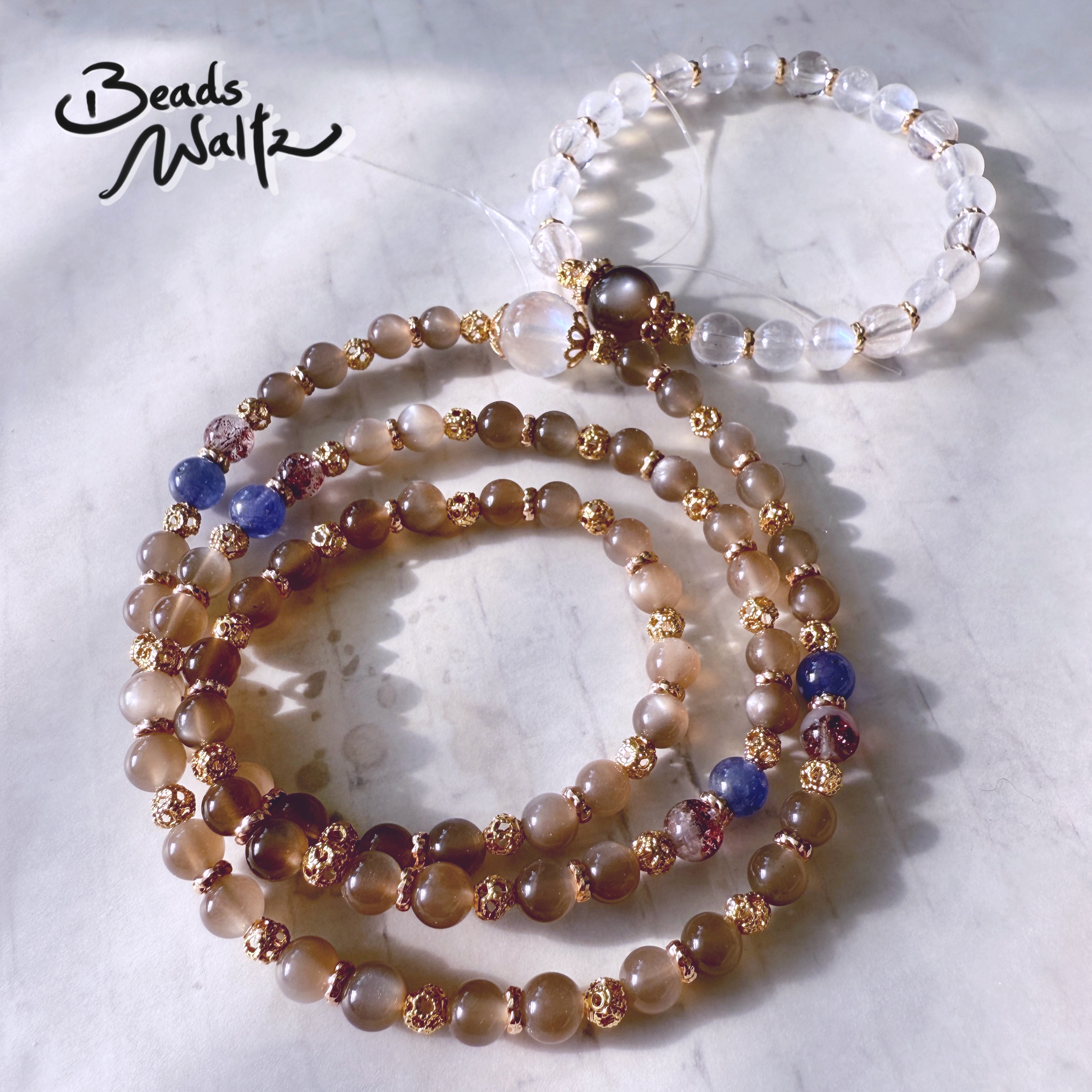 ★ Moonstone 10.5mm, Brown Moonstone 5.5mm, Tanzanite 6mm & Golden Strawberry Super Seven Quartz 5.5mm