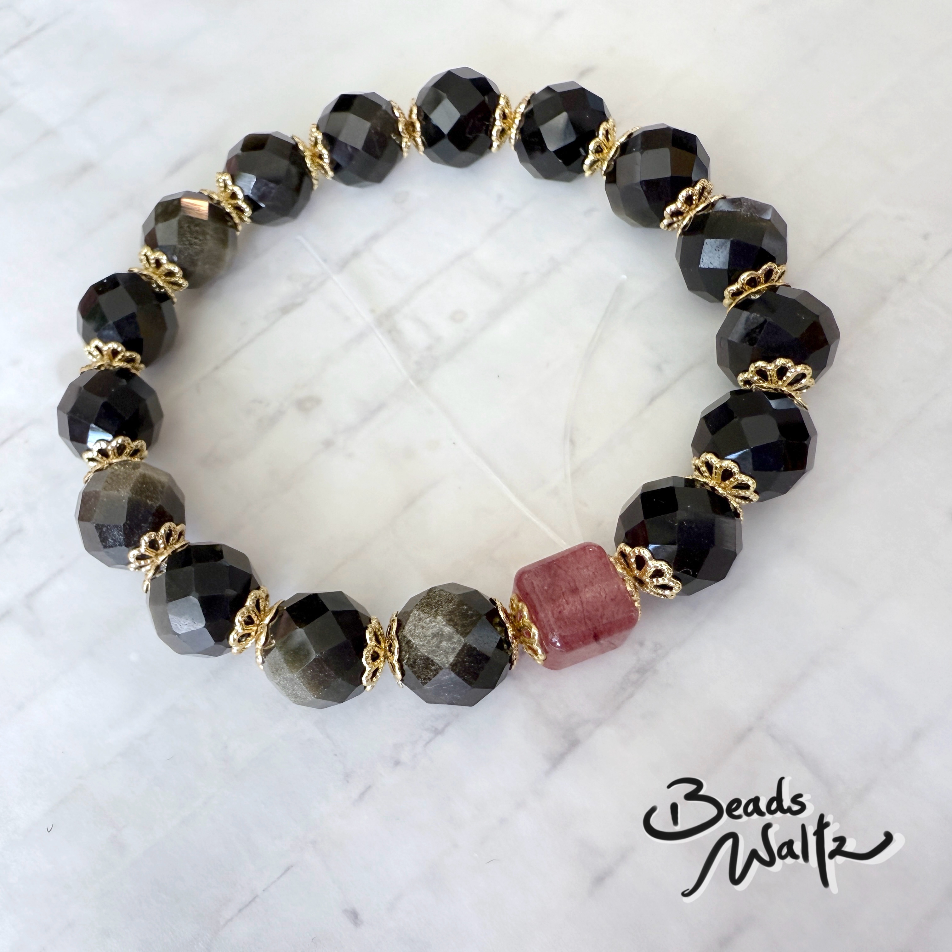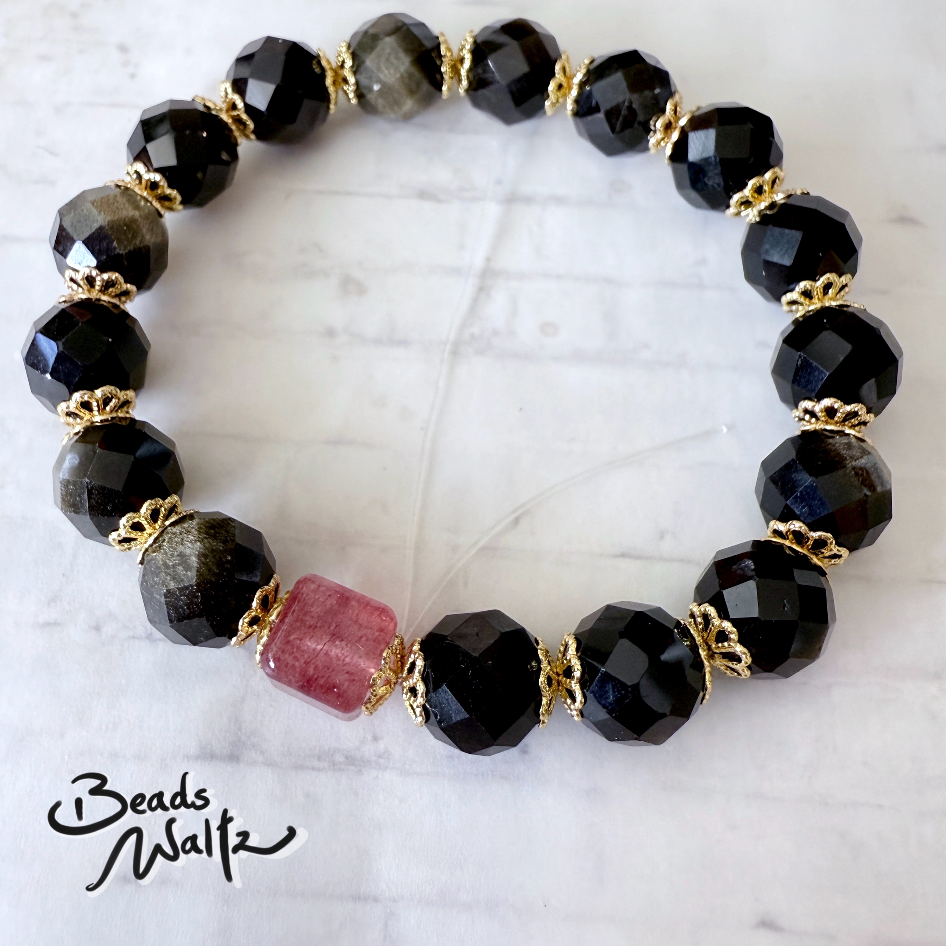 ★ Obsidian 10mm & Strawberry Quartz 8x8mm