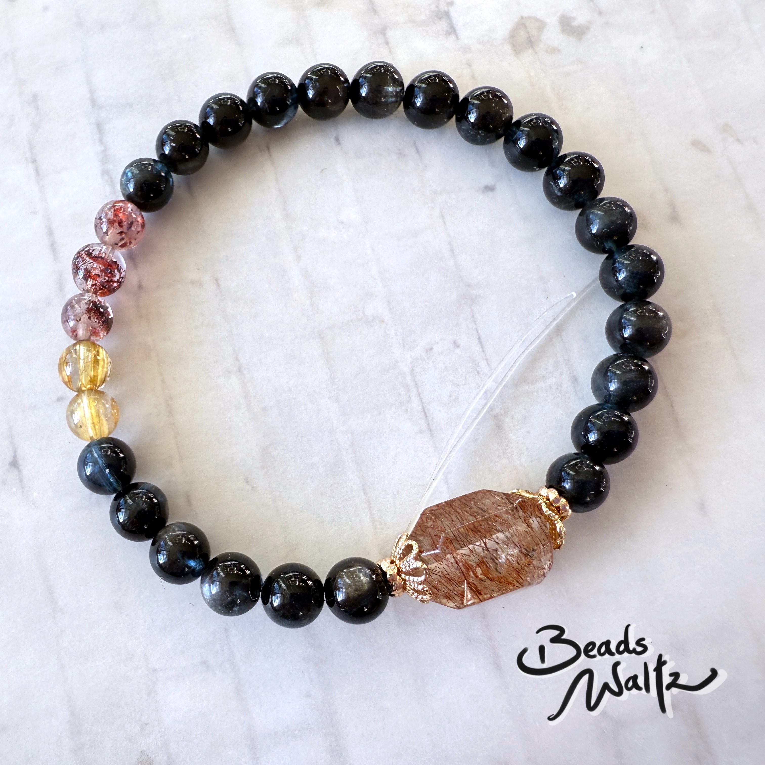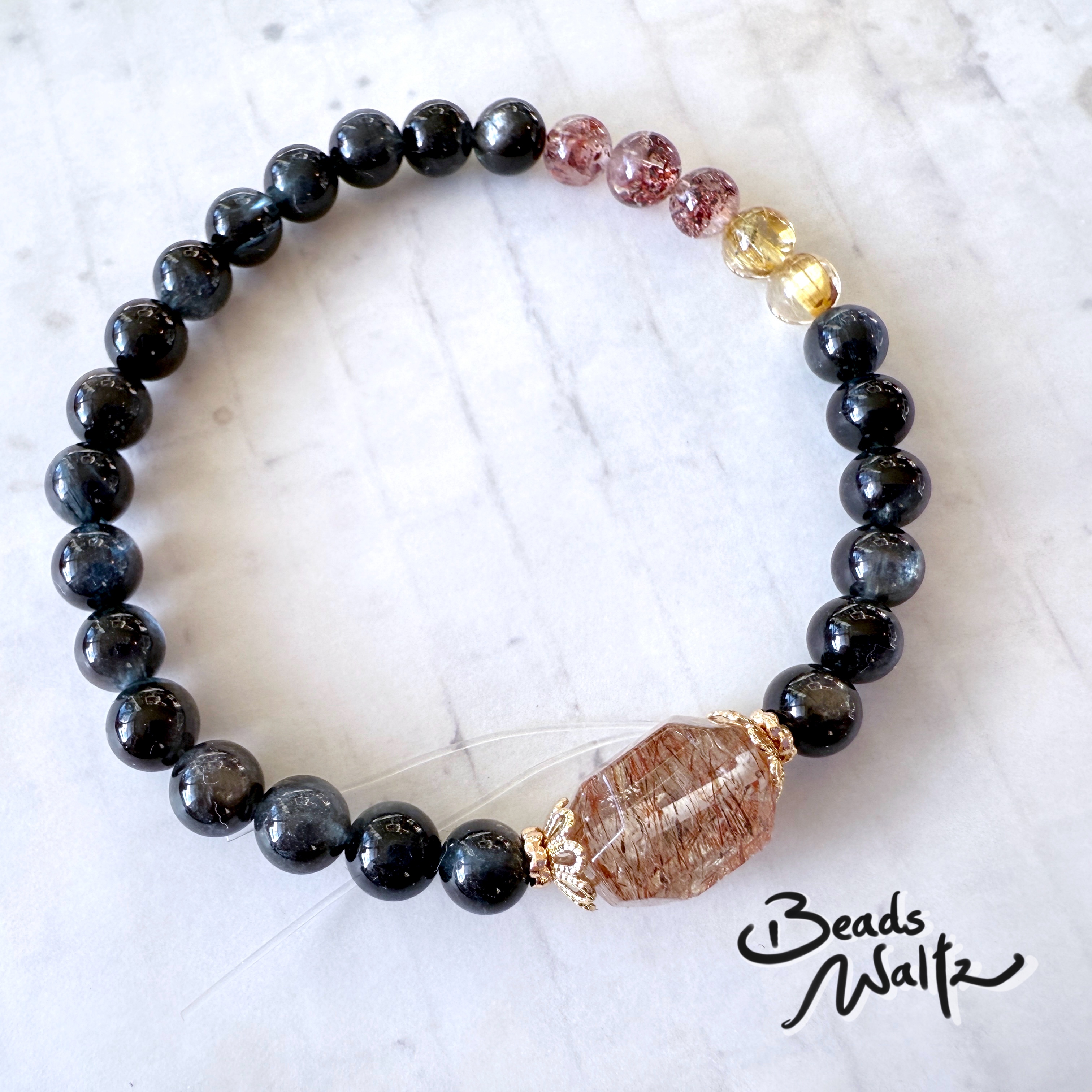 ★ Shiny Black Aquamarine 6.5mm, Golden Rutilated Quartz 5.8mm, Strawberry Super Seven 5.5mm & Red Super Seven 10x14 mm ★ Wrist size: 15.5cm ★ If you need different sizes, please email us: This email address is being protected from spambots. You need JavaScript enabled to view it. 【Aquamarine】 Throat Chakra Birthstone of March Happiness, longevity, composure, and courage Enhance the ability to express and convince, strengthen confidence The water element protects the safety of navigation