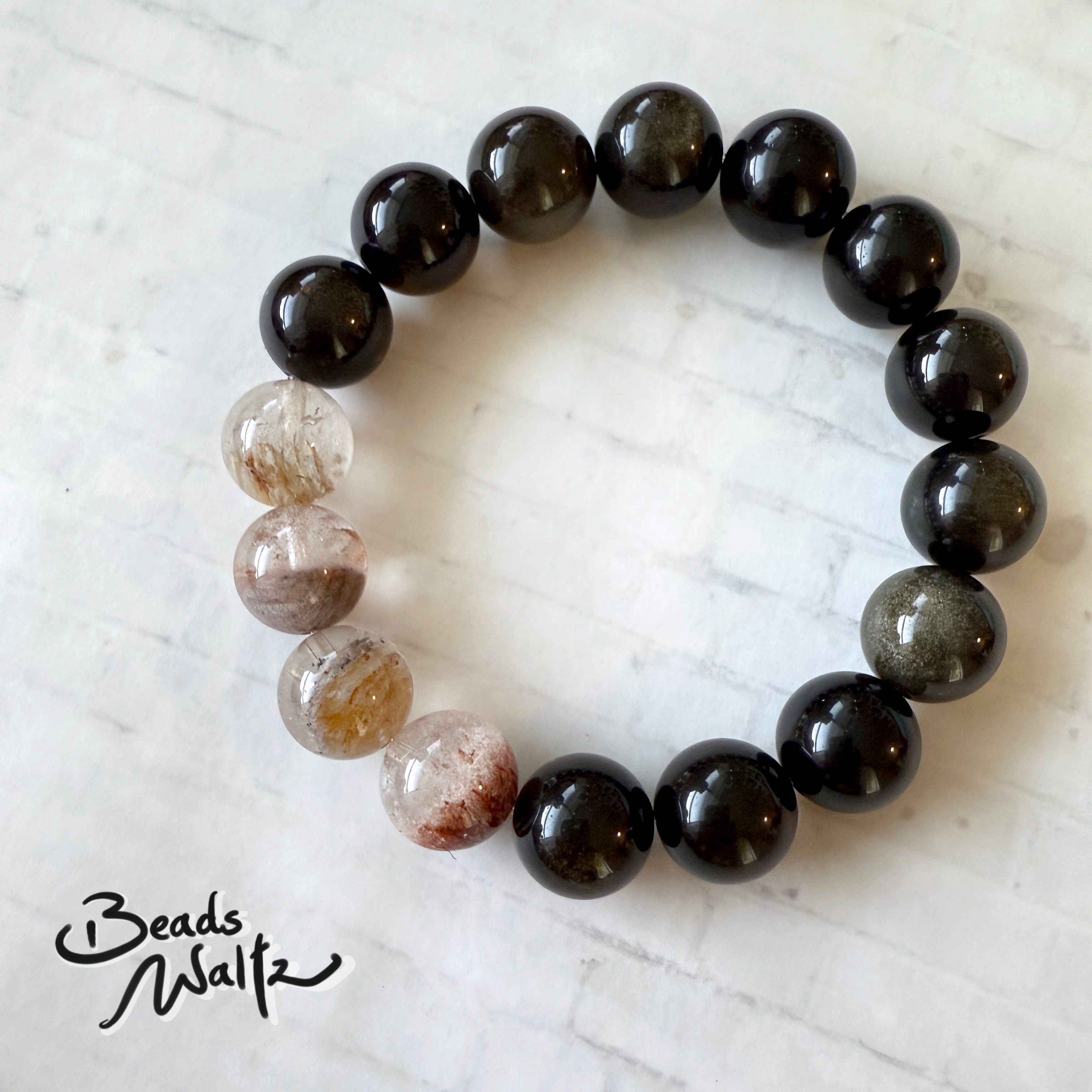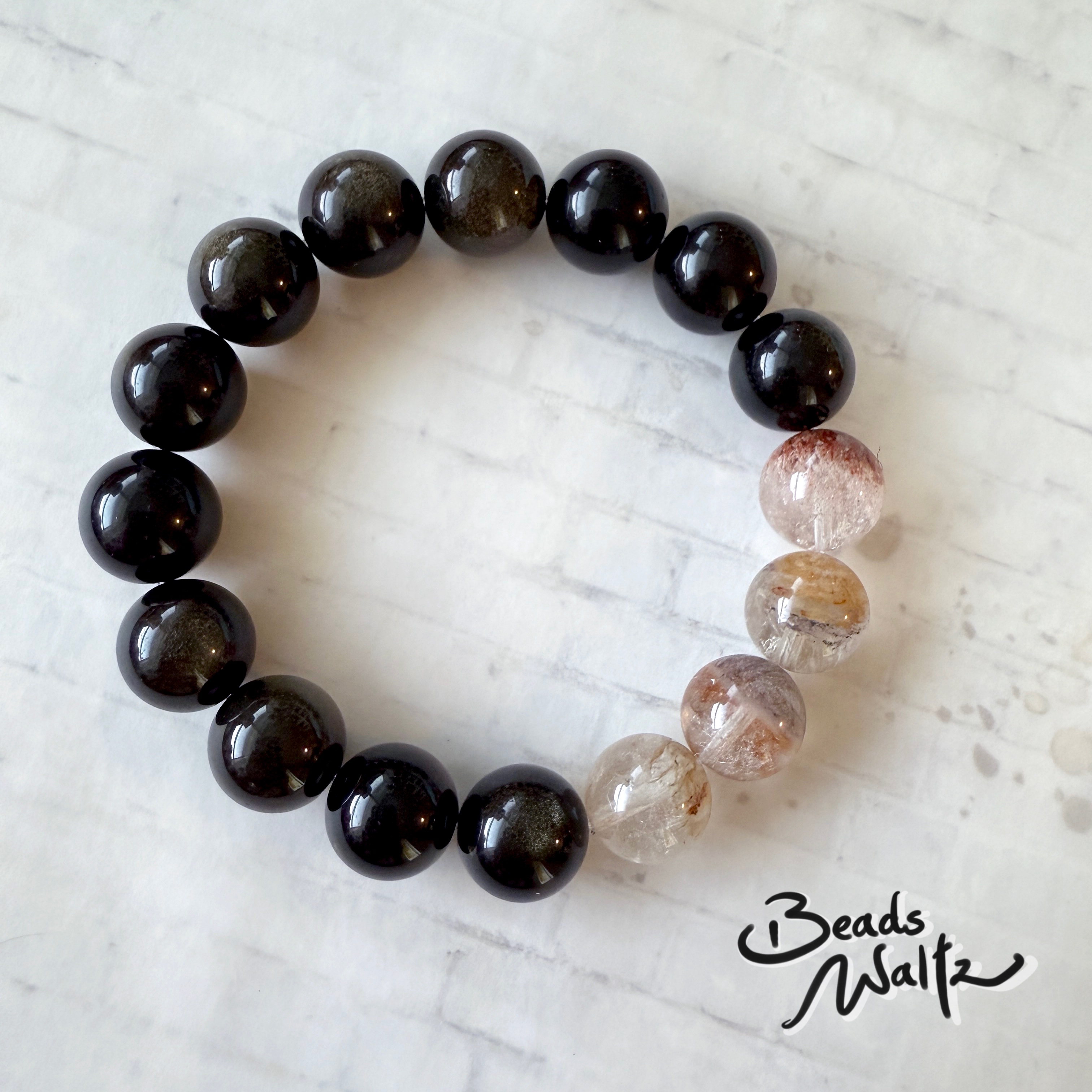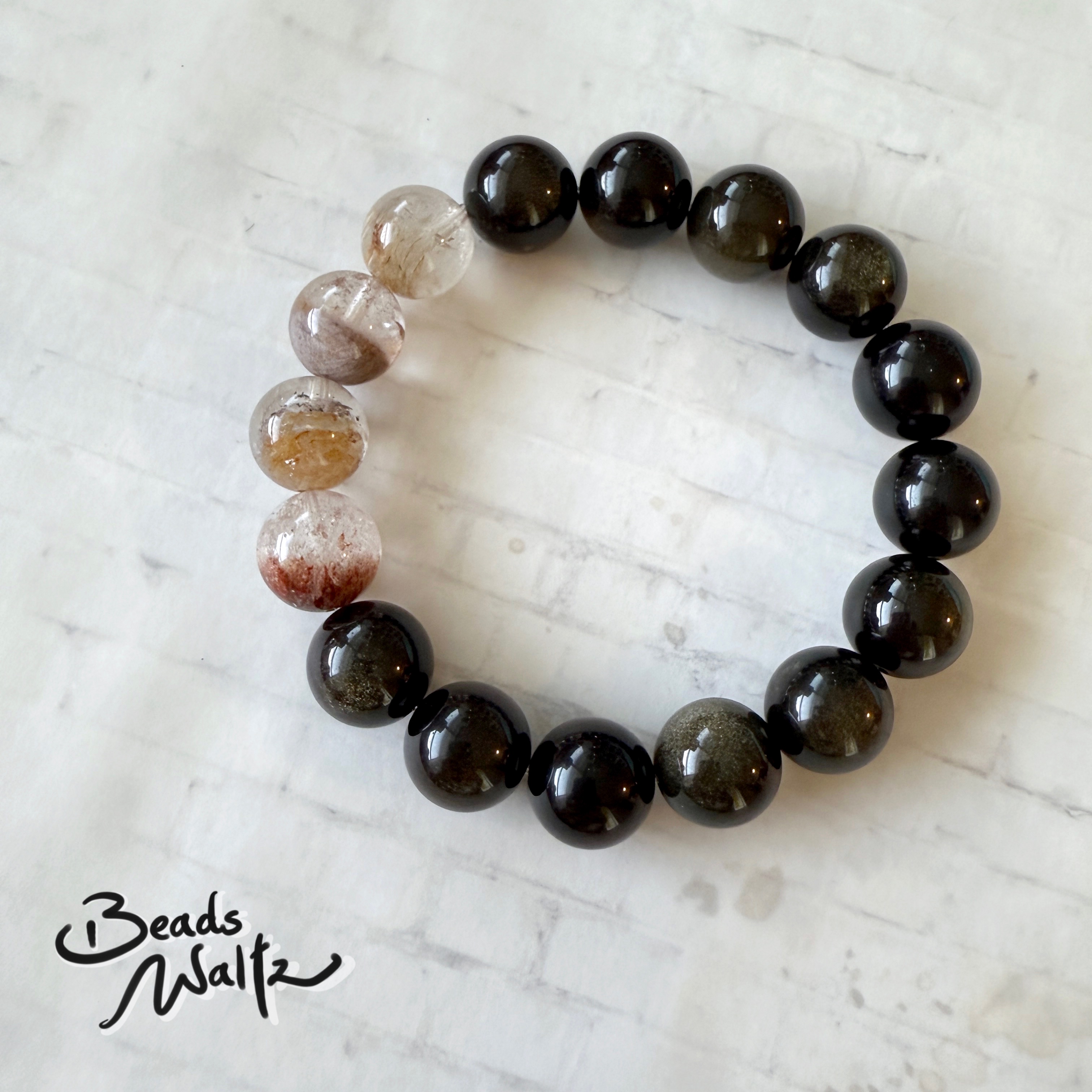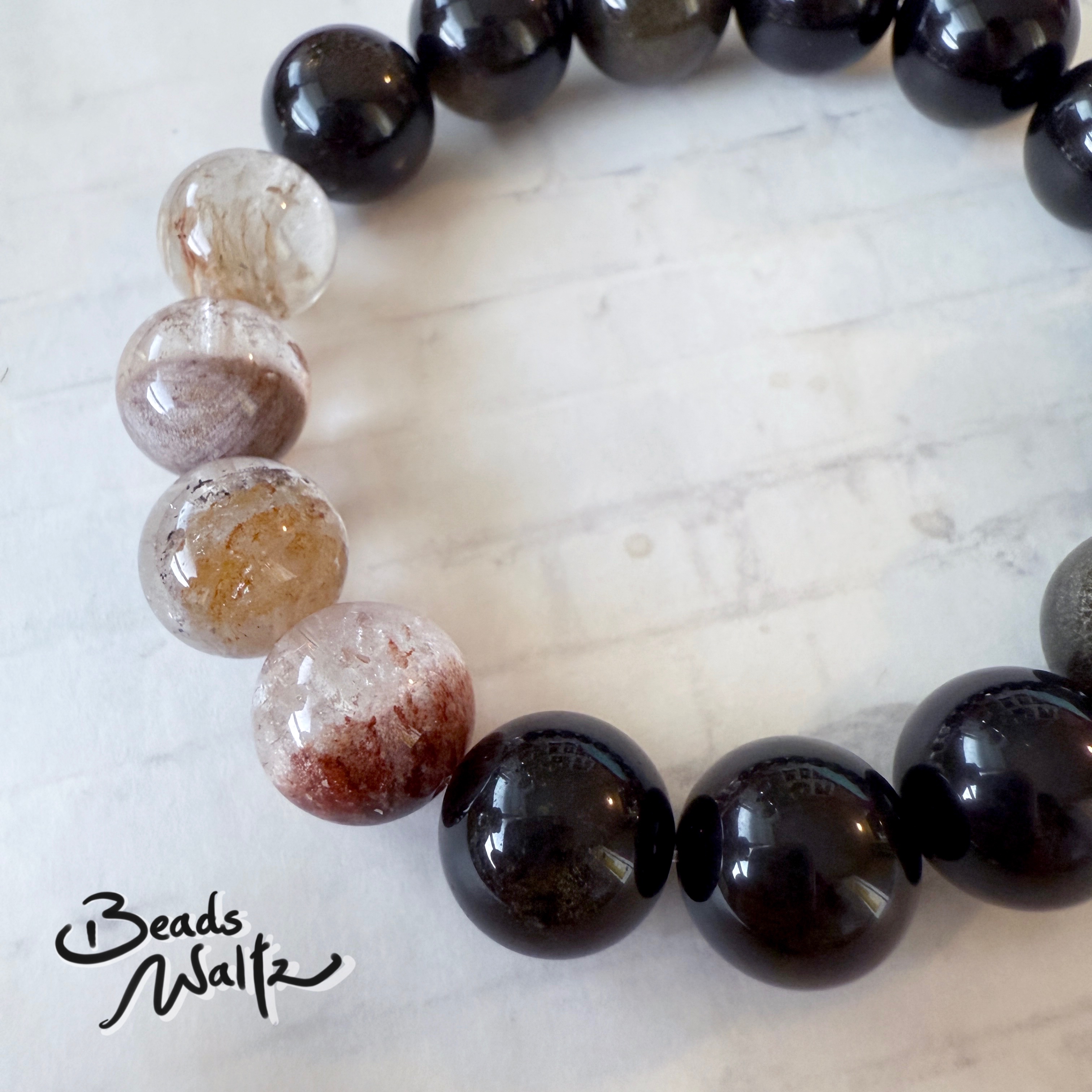 ★ Obsidian 12mm & Hair Rutile Quartz with Phantom (paragenous mineral) 12mm ★ Wrist size: 15.5cm ★ If you need different sizes, please email us: This email address is being protected from spambots. You need JavaScript enabled to view it. 【Obsidian】 Root Chakra Get rid of the filthiness of body and mind Eliminate negative energy and increase courage The most powerful stone for blocking evil spirits and disasters Keep backstabbers away Recommend to wear on the right hand