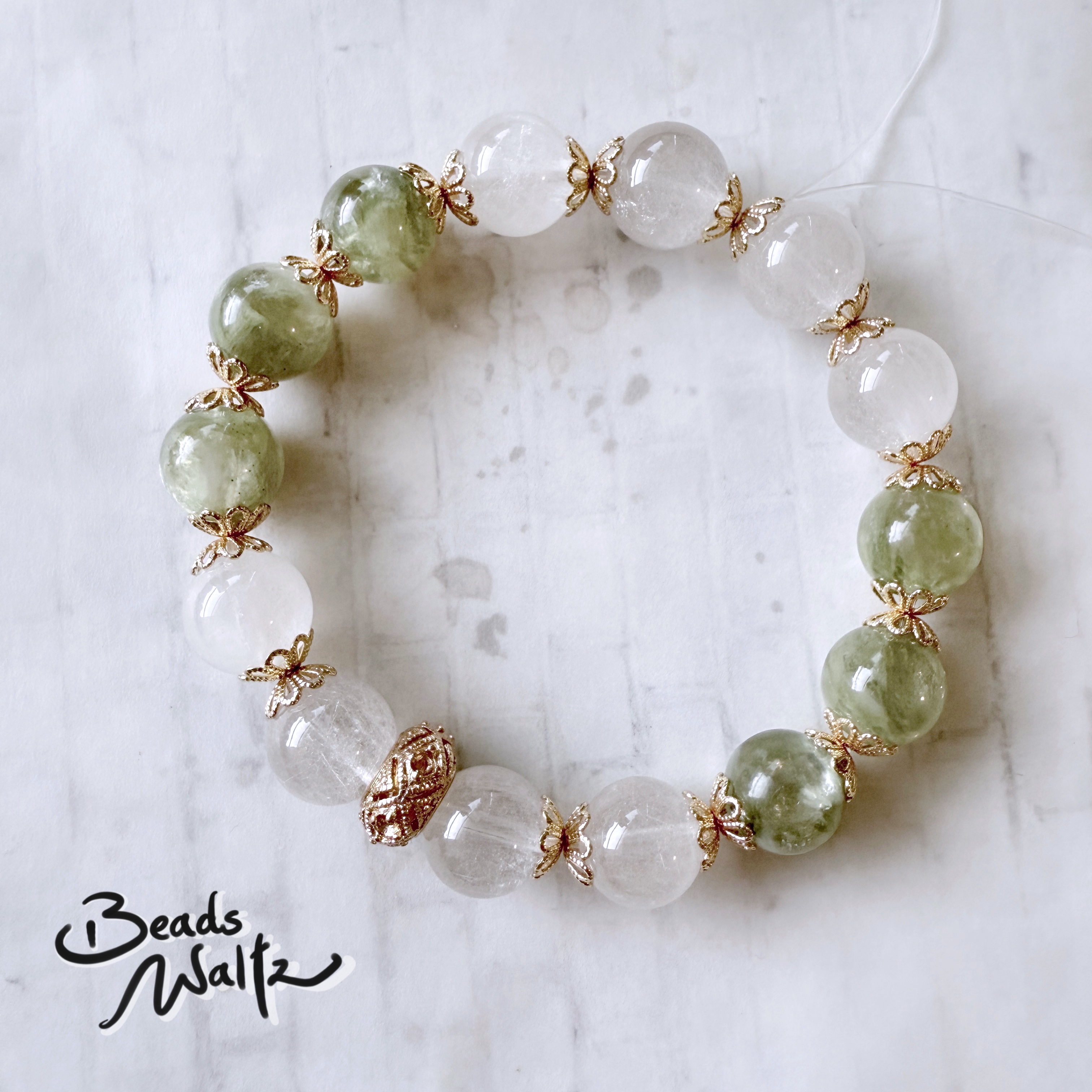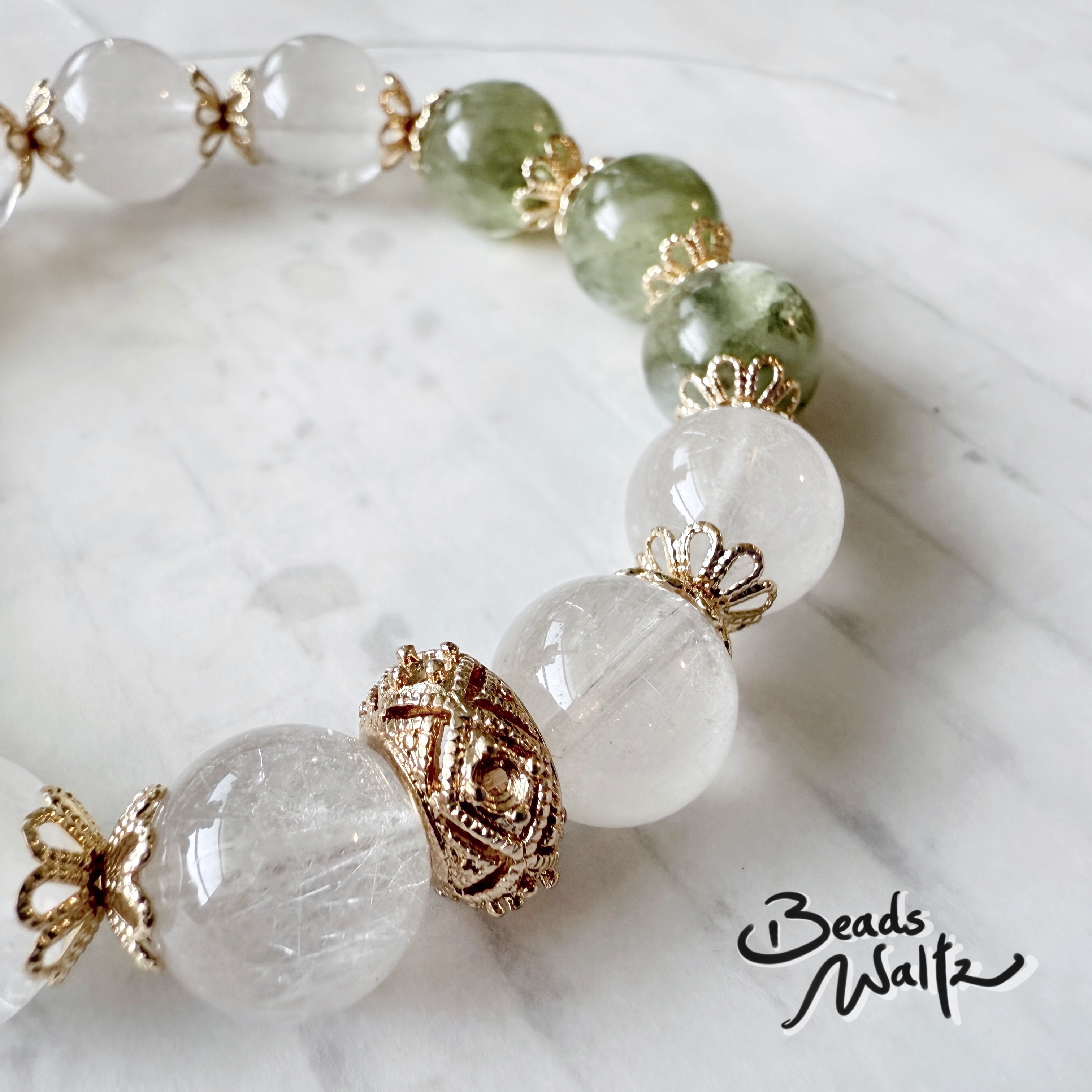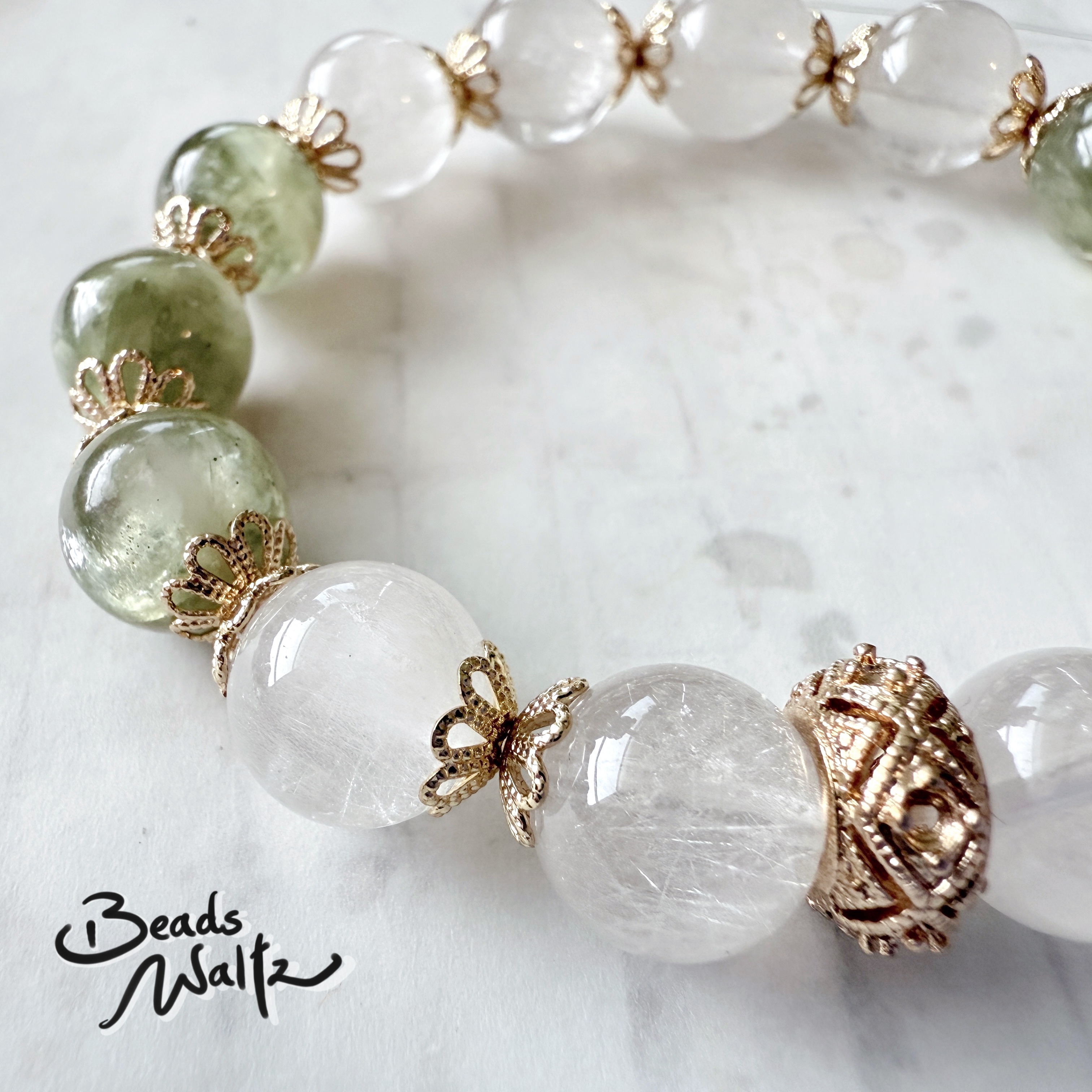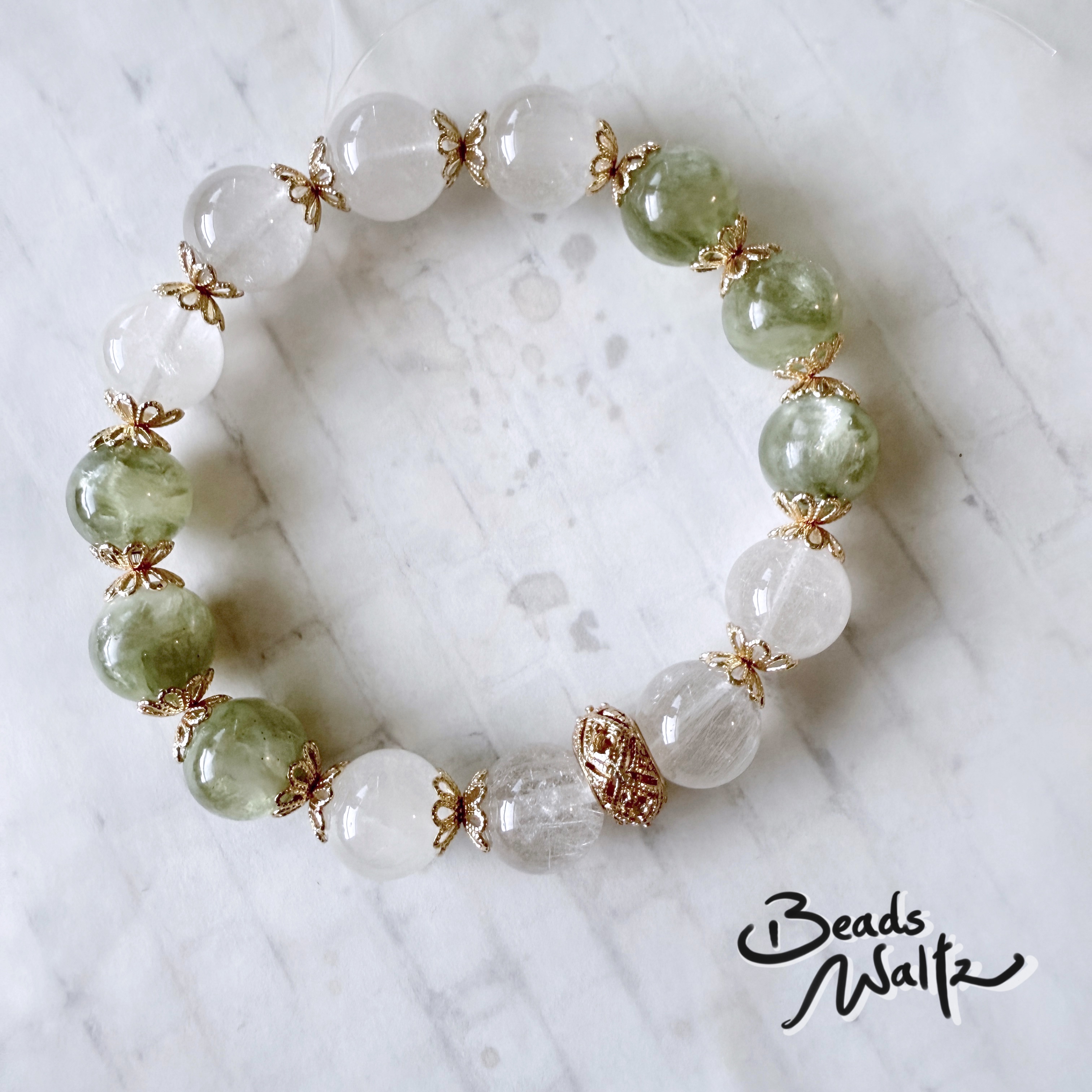 ★ White Rabbit Hair Rutile Quartz 10.5mm & Green Lepidolite 10mm