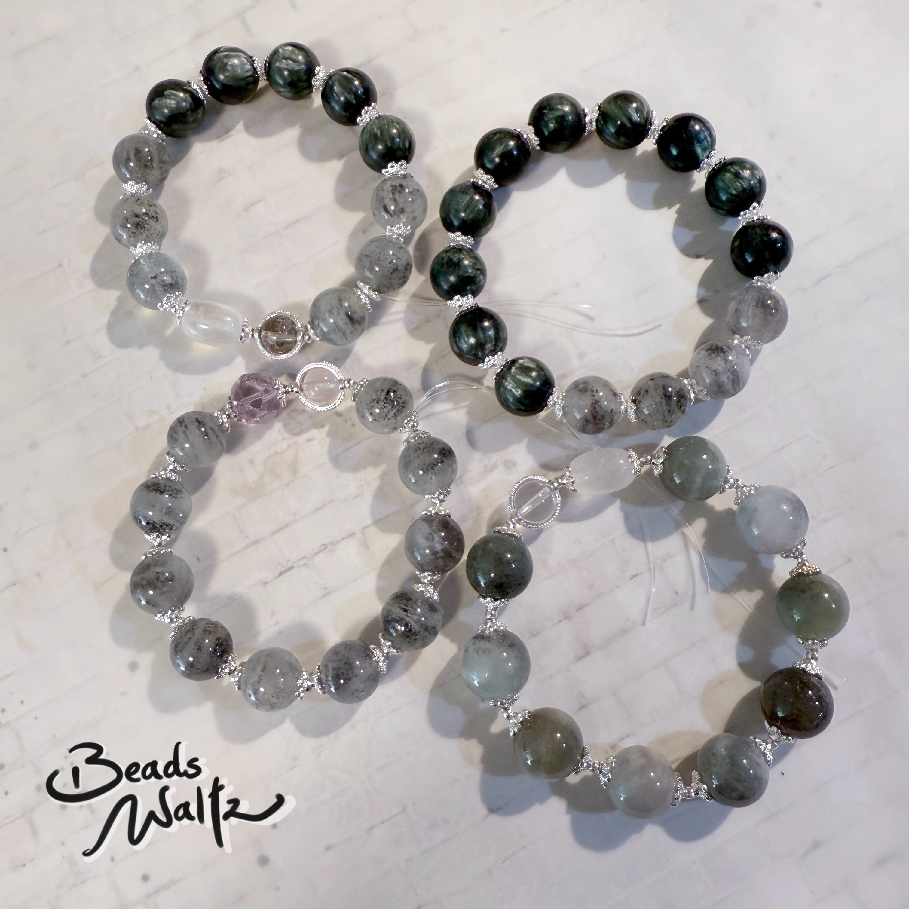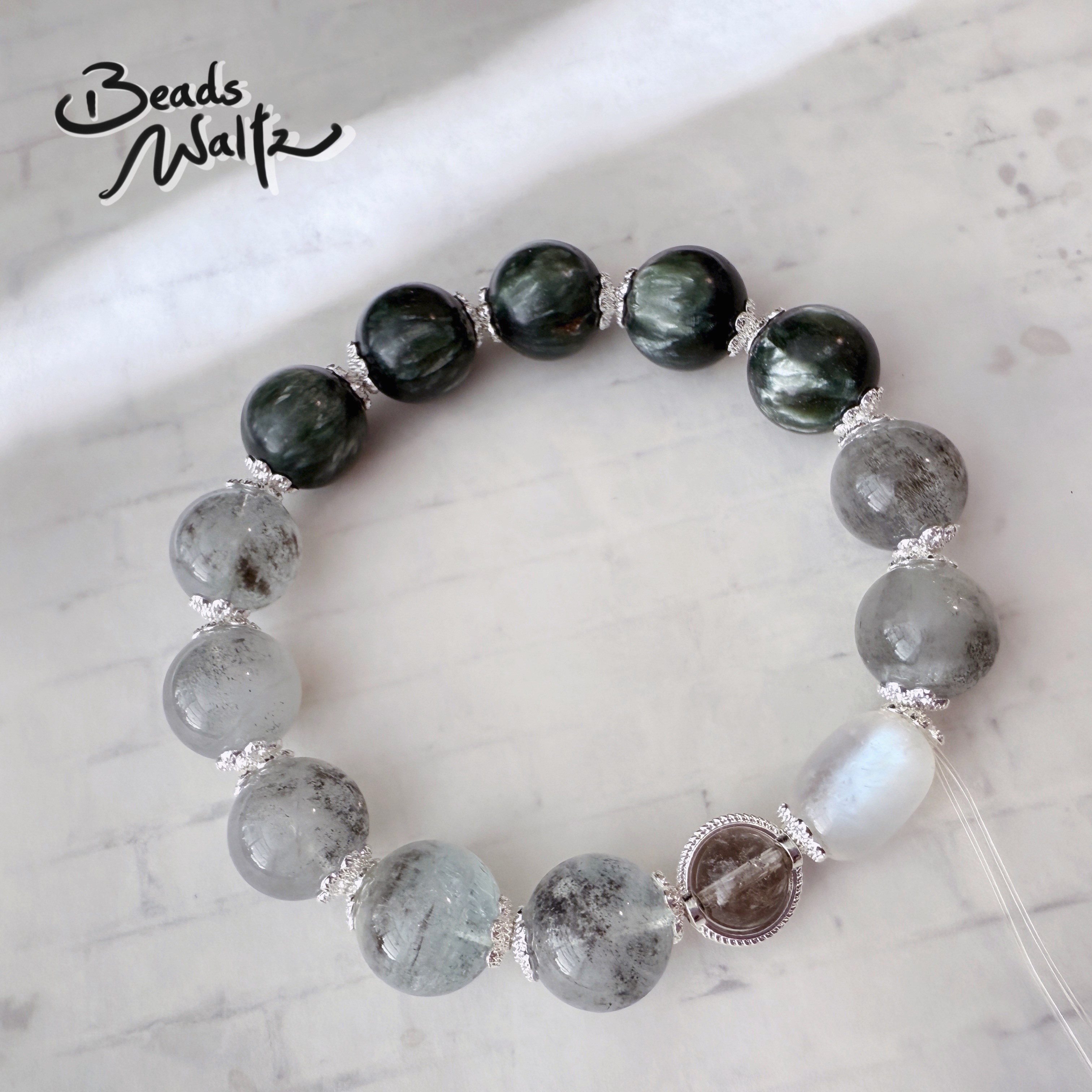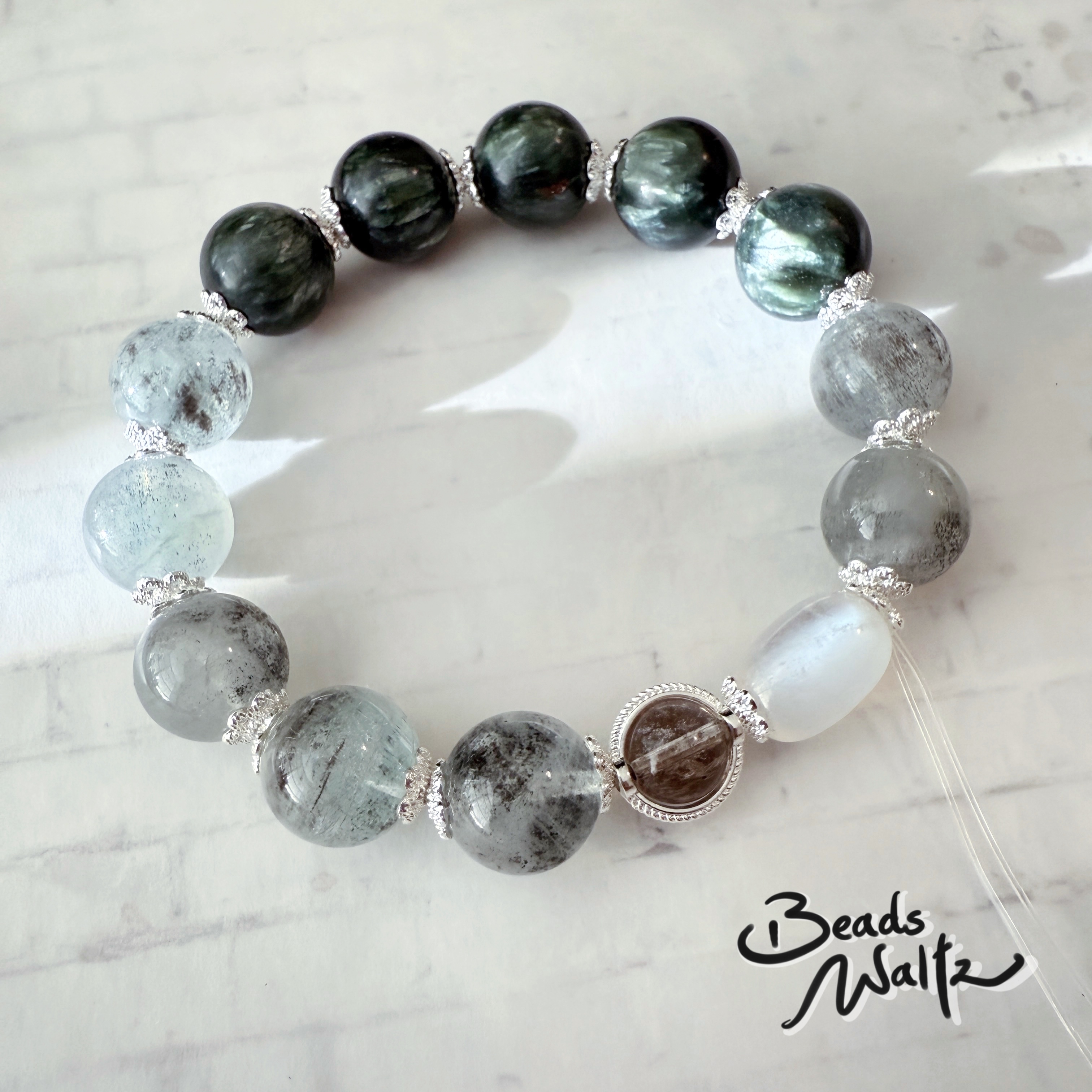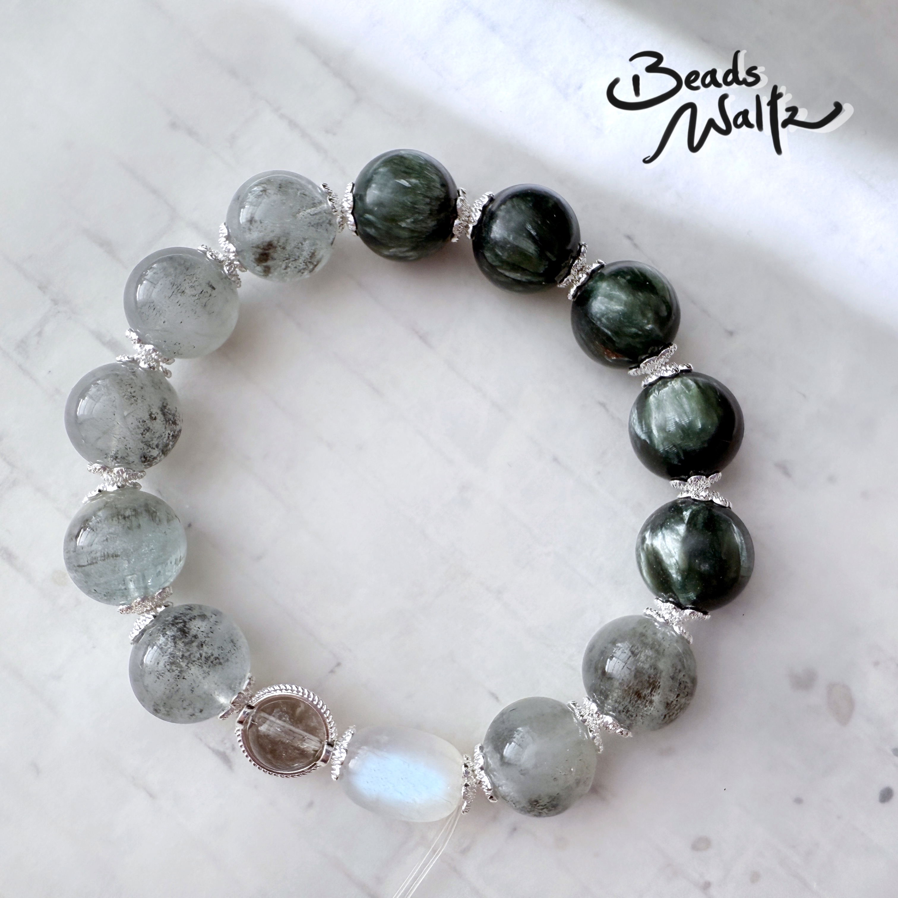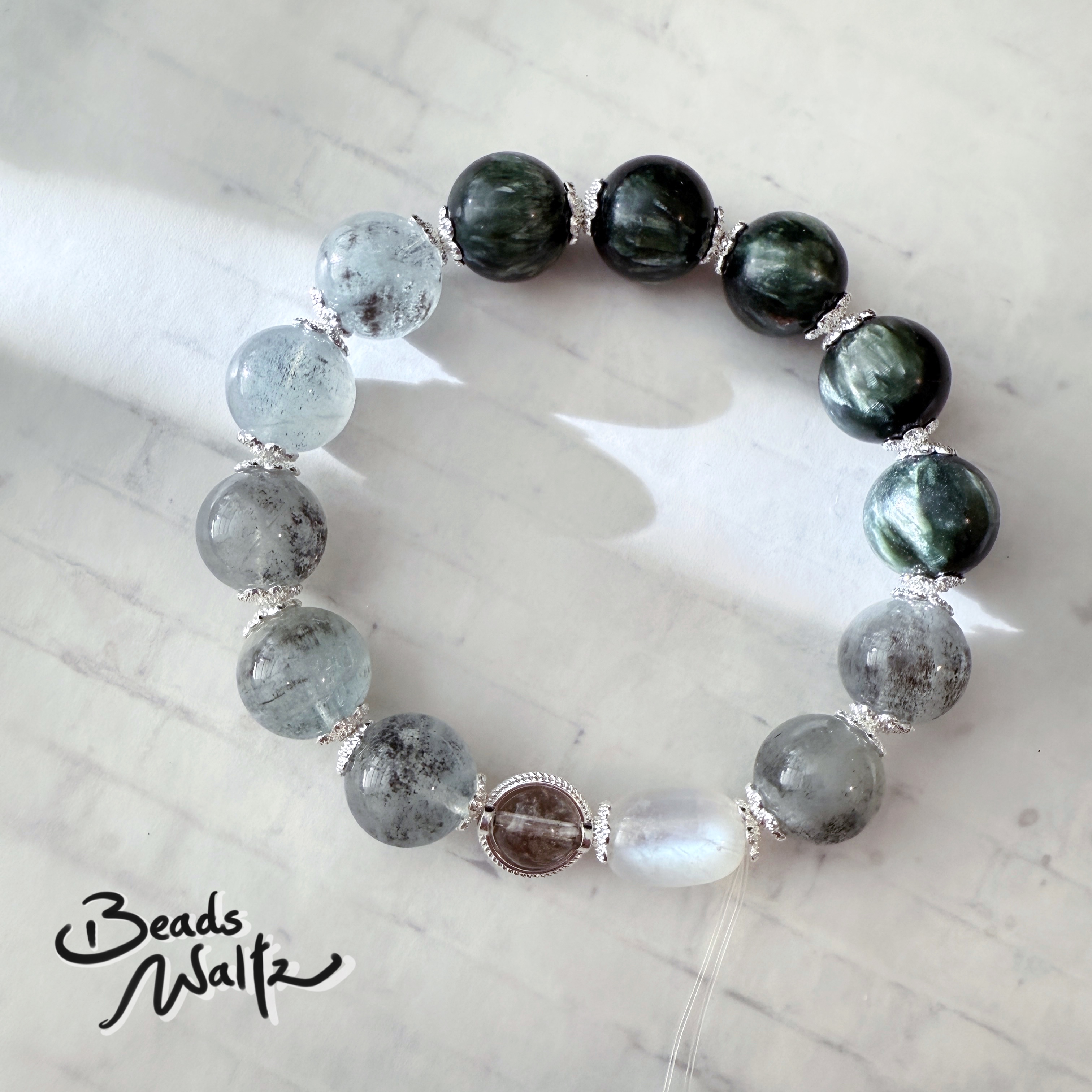 ★ Aquamarine 12mm, Moonstone 9x13mm, Brown Azeztulite Quartz 8mm & Seraphinite 12mm